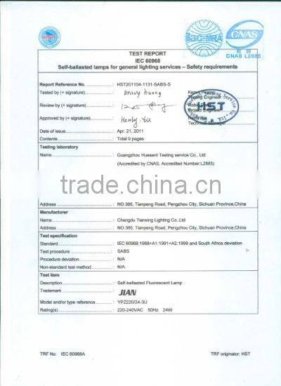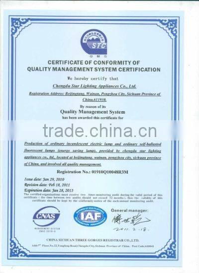 The Company has advanced production equipments, powerful technology force, premium quality of products, sound quality system, the products of the company are well sold and well received in the country and a number of foreign areas as well, such as Europe, Middle East, Southeast of Asia, Africa and so, the annual output for exporting more than 400 million. The company has passed ISO9001, and the "JIAN" trademark has been appraised as "Most Famous Sichuan Brand", "Most Famous Sichuan Product" has been honored "one of the most potential companies of electric lighting source" by Chinese illume association, awarded the AAA grade quality credit rating certificates by Bureau of Quality and Technical supervision, granted "The Second-Class Enterprises of Industrial Goods for Exporting of China" by Entry & Exit Inspection and Quarantine Bureau of Sichuan.