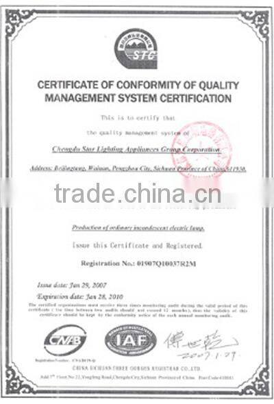 Chengdu Tianxing Lighting Co., Ltd, located at Beijingtang, south of Pengzhou City, Sichuan Province, China. It is one of the key enterprises specializing in producing illuminative electric appliances in the country. The main products are standard incandescent series, energy saving lamp, ball lamps series, candle decorative lamps series, Infrared ray lamp series and so on. The yearly production of 300 million incandescent light ranks 5th in China.